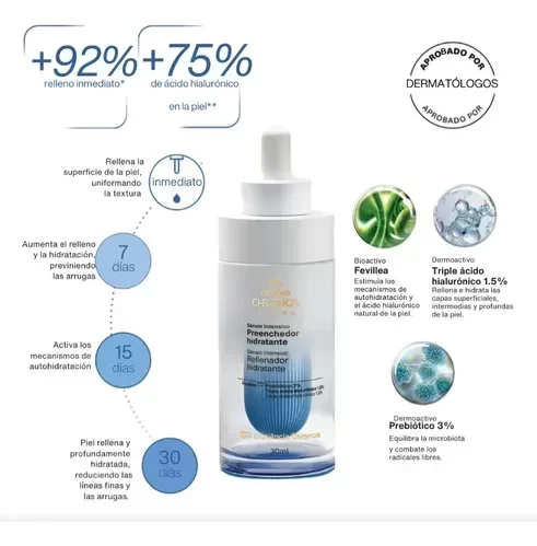 *Porcentaje de mujeres con resultado positivo en test clínico e instrumental. La tecnología exclusiva y patentada de Chronos, que combina ingredientes de la naturaleza con activos dermocosméticos, rellena e hidrata las diferentes capas de la piel de manera inmediata, progresiva y duradera.