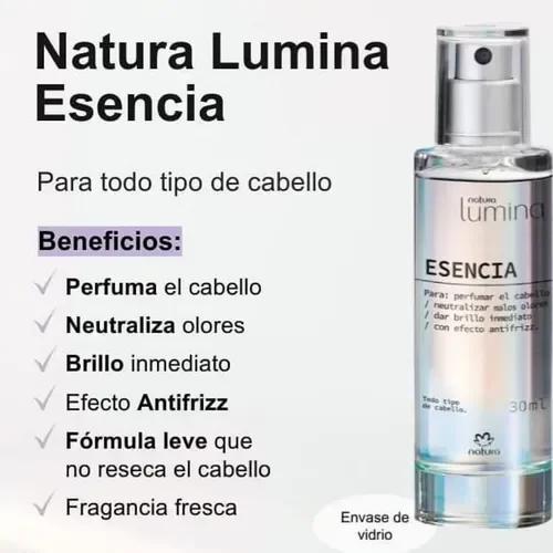 La Esencia Lumina es un perfume capilar finalizador, ideal para todo tipo de cabello. Neutraliza malos olores, aporta brillo inmediato y reduce el frizz con una fórmula ligera que no reseca. Su aroma moderno combina hojas verdes, lima de Persia y ámbar, ideal para el uso diario sin enjuague.