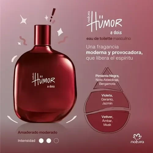 El perfume Humor a Dois de Natura en su presentación de 25 ml es una fragancia amaderada intensa y audaz, ideal para llevar a todas partes. Combina especias frías con un toque de ciruela y un fondo amaderado, creando una mezcla provocativa, moderna y vibrante, perfecta para hombres que buscan intensidad en un formato compacto